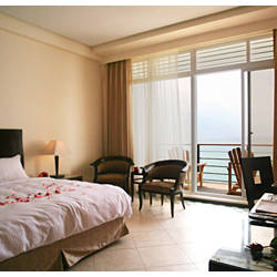 從海景房推開窗戶,映入眼簾的是一片碧波萬頃,緊鄰著臨海大廳,更是一處令人想要立刻赤足飛奔的美麗貝殼沙灘。從山景房則可直接眺望大尖山和一片綠油油的牧場山坡,視野開闊,令人心曠神怡。