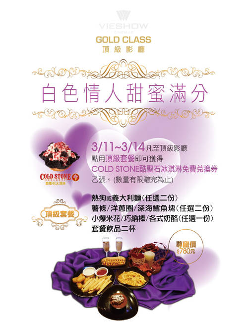 3/11~3/14白色情人節期間凡至高雄威秀影城頂級影廳點用頂級套餐即可獲得