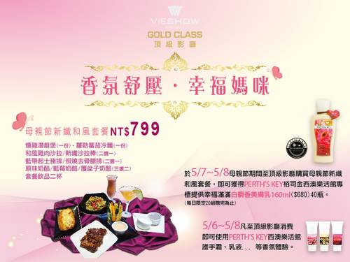活動內容:母親節期間至高雄大遠百威秀影城頂級影廳購買母親節新纖和風套餐,即可獲得柏司金西澳樂活館專櫃提供幸福滿滿白麝香美膚乳160ml($680)40瓶。(每日限定20組贈完為止)母親節新纖和風套餐:NT$799燻雞潛艇堡(一份)、蘿勒蕃茄冷麵(一份)、和風雞肉沙拉/新纖沙拉棒(二選一)、藍帶起士豬排/照燒去骨腿排(二選一)、原味奶酪/藍莓奶酪/覆盆子奶酪(三選二)、套餐飲品二杯。