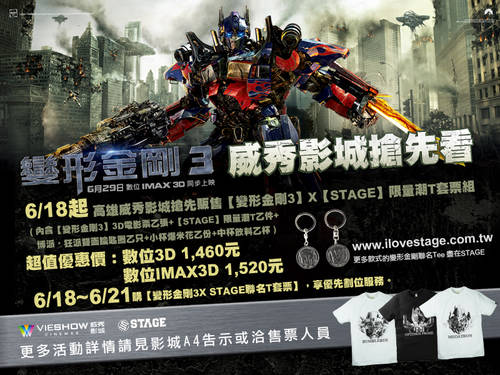 高雄大遠百威秀影城數位IMAX3D「變形金剛3」震撼體驗無可取代,6/18起搶先販售變形金剛3+STAGE限量潮T套票禮盒組(內含變形金剛3電影票乙張+STAGE限量潮T乙件+博派.狂派雙面鑰匙圈+小杯爆米花乙份、中杯飲料乙杯,超值優惠價:數位3D只要1,460元、數位IMAX3D 1,520元6/18~6/21購套票禮盒組還可享優先劃位服務,詳情請洽高雄威秀影城07-3345566。