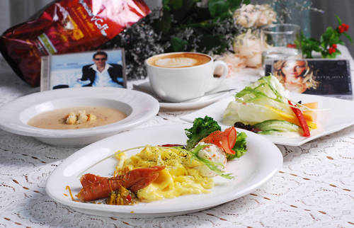 主廚湯品 or 牛奶 + 沙拉 + 主餐 (洋芋泥+麵包+鮮奶蛋) + 燒肉 or 德式香腸 or 水果 + 飲料