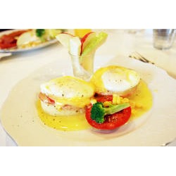 棻園brunch人氣王班尼迪克蛋緣自美國紐約客最愛的早午餐料理,在咬勁十足的英式瑪芬上,依序舖上蕃茄片、香煎火腿片及靈魂人物-爆漿半熟水波蛋,再淋上棻園獨門秘方的荷蘭酸奶醬,值得把盤底舔乾朝天啦~還有別忘了扮演解膩功臣的油醋烤蕃茄及幫助消化的水果盅,每份餐點搭配除了配色外更有其搭配的意義;