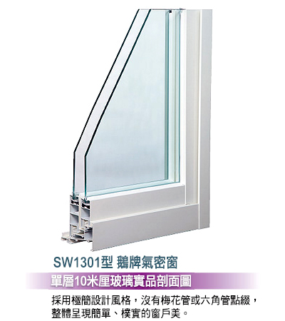 規格說明鵝牌1301型單層(10mm玻璃)氣密窗,替您擋住屋外的風風雨雨,讓您能在屋內寧靜,無憂無慮的讀雲,納光,欣賞自然