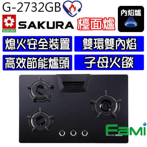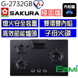 【fami】彰化 櫻花瓦斯爐 檯面式 瓦斯爐 G 2732 GB 三口 雙內燄 玻璃檯面爐 (黑色玻璃)