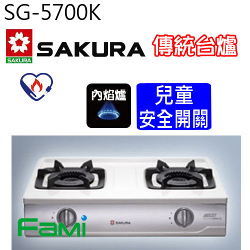【fami】彰化 櫻花瓦斯爐 傳統式台爐 SG 5700K 雙內焰安全瓦斯爐 (不鏽鋼/琺瑯)