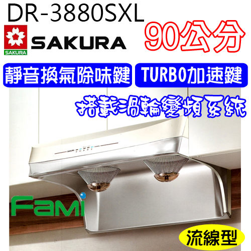 彰化廚具 櫻花 排除油煙機 DR 3880 SXL (90CM) 流線型 抽油煙機 *渦輪變頻* 節能省電,吸力強,噪音小!!