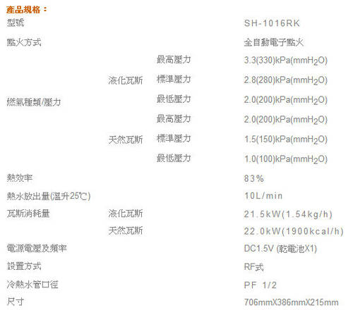 10公升出水量、RF屋外設置型、電池存量顯示、省能環保、ABS自動阻斷防空燒