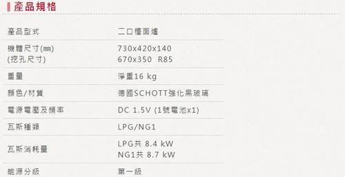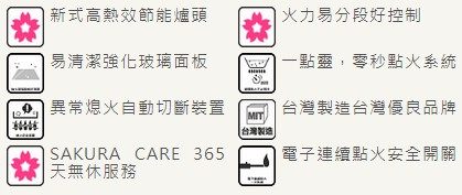 新式高熱效節能爐頭、易清潔強化玻璃面板、零秒點火系統、異常熄火自動切斷裝置、台灣製造