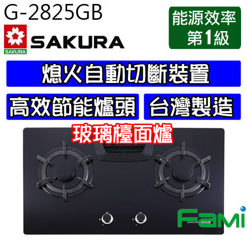 【fami】彰化 櫻花瓦斯爐 檯面式 瓦斯爐 G 2825 GB 二口高效節能 玻璃檯面爐 (黑色玻璃)
