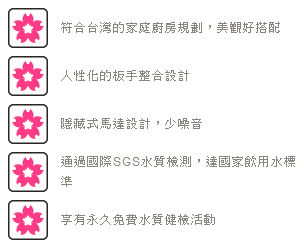 符合台灣的家庭廚房規劃,美觀好搭配、隱藏式馬達設計,少噪音、通過國際SGS水質檢測