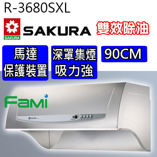 彰化 櫻花除油煙機 斜背深罩式除油煙機 R-3680 SXL (90CM) 深罩式除油煙機(雙效除油)