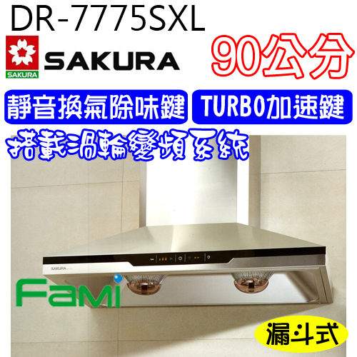櫻花 排除油煙機 DR 7775 SXL (90CM) 漏斗式 抽油煙機 *渦輪變頻* 節能省電,吸力強,噪音小!!