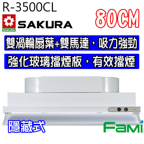 彰化 櫻花除油煙機 隱藏式除油煙機 R 3500 CL (80CM) 隱藏式除油煙機