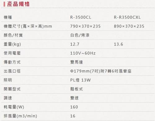 雙渦輪扇葉+雙馬達,吸力強勁、全新造型強化玻璃擋煙板、馬達過熱保護裝置、台灣製造