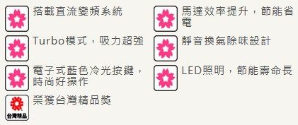 搭載直流變頻系統、馬達效率提升,節能省電、Turbo模式,吸力超強、榮獲台灣精品獎