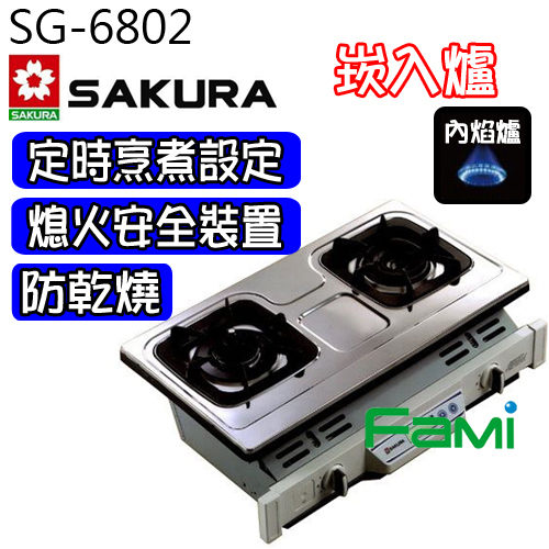 彰化 櫻花瓦斯爐 崁入爐 SG 6802 雙內焰 防乾燒 崁入式 安全爐