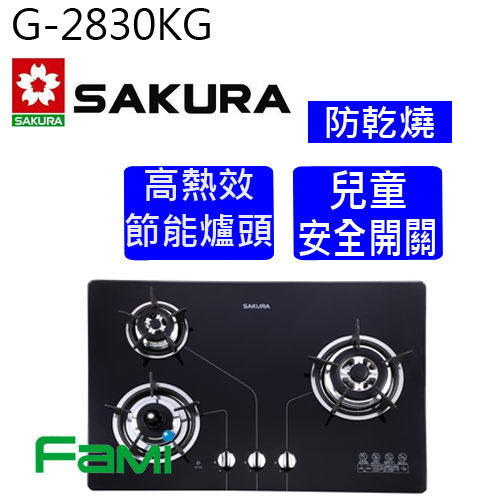櫻花瓦斯爐 檯面式瓦斯爐 G 2830 KG 三口防乾燒節能檯面爐 (黑/白)