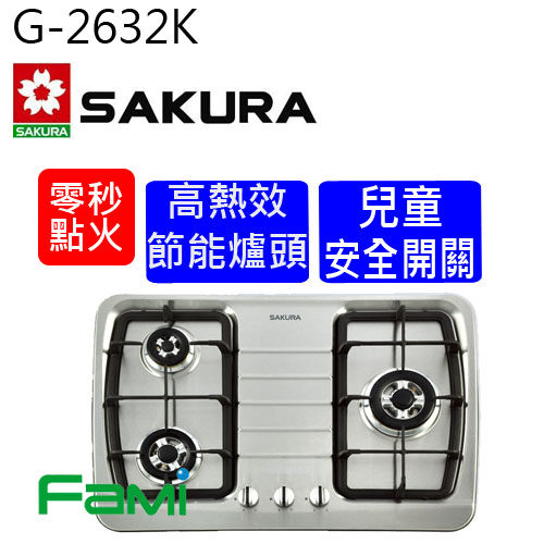 彰化 櫻花瓦斯爐 檯面式瓦斯爐 G 2632 K 三口節能檯面爐 (不鏽鋼/琺瑯)