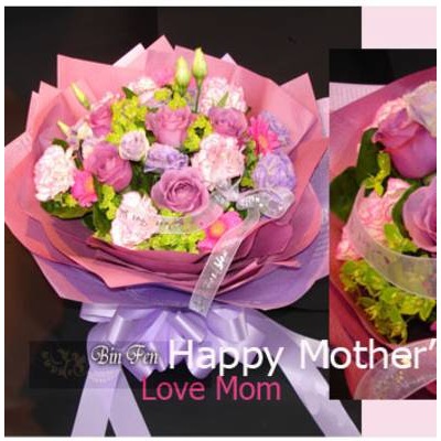 名稱:高雅好馨情〈母親節首選〉 材質(料)說明: 玫瑰、進口雙色康乃馨、迷你太陽花、深山櫻 包裝規格: 50*60cm 售價:1599