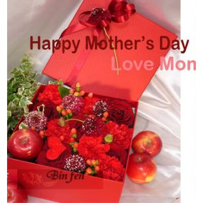 材質(料)說明: 松崇草、美國紅大康乃馨、紅玫瑰、高級盒子、蘋果
