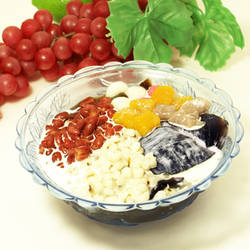 芋圓豆花是以九份芋圓,手工製的白豆花搭配而成,當然也有很多其它配料,如紅豆,綠豆,仙草,薏仁等而紅豆又以精挑出名的大顆粒,紅豆酵母冰是本店的招牌之一