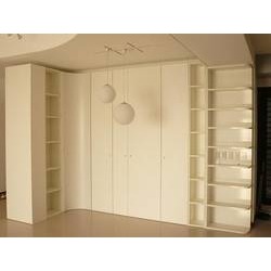 衣櫃 + 開放置物櫃,充份運用樑柱的空間,用弧型開放櫃補足衣櫃與牆柱之間的空白處,使櫃面成為一個整體;L型櫃背面充當玄關,並有鞋櫃功能,弧型轉角門以不同於系統櫃的特殊方式製做,讓組櫃體有滑順溫柔,令人放鬆的舒服感覺。