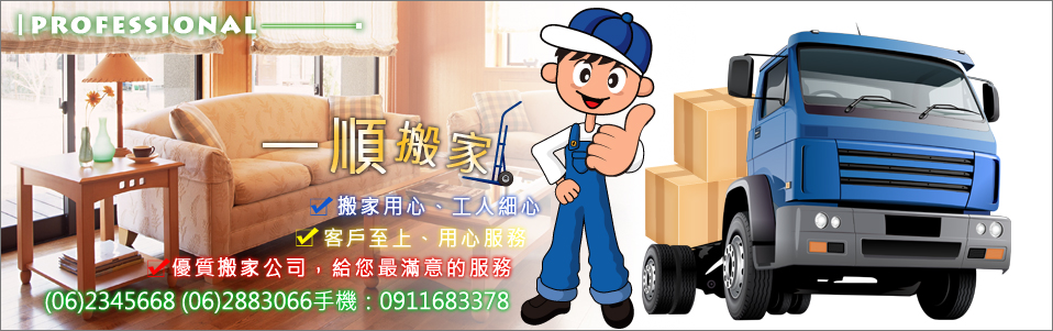 一順搬家公司,為了選擇一家優質的搬家公司而不知所措,害怕受騙上當,於是提供了一整套完整的簽訂估價契約及物品損害協商理賠制度,讓消費者能從中獲得自身最大的權益與保障。本公司的現場搬家人員,都具有10年以上的搬家服務經驗,都具有專業優質搬家及免費到府估價的能力,簽約後,也會提供客戶搬家所需的紙箱。 老闆:逄庚霖 先生,也是台南搬家工會優良會員的成員。