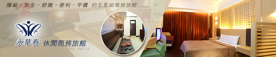 自然人性五星級的庭園造景─永華春休閒商務旅館,一向本著以客為尊的服務理念,在房間設備上更不惜重金設置奈米殺菌光燈、情趣椅、反偷拍設備、按摩椅、SPA水療按摩浴缸、蒸氣室、免費寬頻上網,並提供完整的商務、休閒服務設施,包含了商務中心、電腦中心、交誼廳、會議室、健身房、全套SPA三溫暖中心及新增設的娛樂角(包括Wii sports、空氣曲棍球、足球娛樂台及活力撞球台)。另有令人嘆為觀止豐盛的中西自助式早餐,為您一天的開始準備充沛的活力。