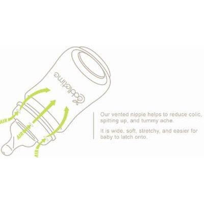 Coddletime奶嘴的寬頸設計,不是只有一個排氣孔而是三個,這個使我們的奶瓶功能優於其他防止腹部絞痛的奶瓶。我們的奶瓶容易使用,沒有額外的零件需要清洗。Coddletime奶嘴能排除氣體 有助於減少絞痛,痰的產生,和肚子疼。
