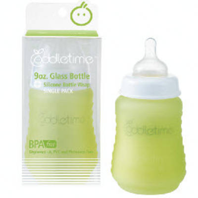 硬質硼矽玻璃製成奶瓶 + 綠色食品級矽膠的奶瓶外層