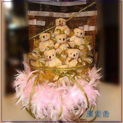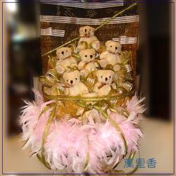 ☆花材說明-米色小熊6隻-加咖啡色雪紗和包裝紙和粉紅色羽