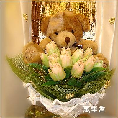 ☆花材說明-15公分小熊一隻 加人造鬱金香花束和精緻網紗
