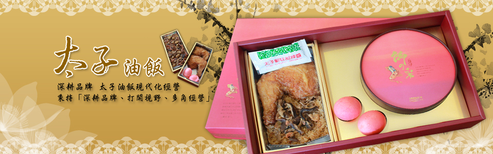 太子油飯,仍不忘傳統,堅持以古法製作,也運用科學儀器嚴格控制品管,為的即是讓顧客能品嚐到精緻與美味兼具的油飯禮盒。除了油飯禮盒之外,因應多元的市場,太子油飯也提供麻油雞、彌月蛋糕、苦茶油、紅蛋等。
