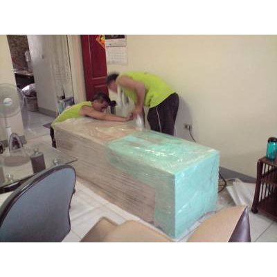 包裝流程:先以毛毯或棉被包覆後再以伸縮膜封牢。