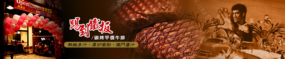 踢到鐵板 碳烤平價牛排 踢到鐵板的陳老闆跟李老闆多年來鍾愛牛排,走遍大街小巷搜尋好吃牛排,發現牛排要好吃,秘訣就是先煎後烤,享受之餘也決心將多年來品嚐牛排心得奉獻出來,成立「踢到鐵板碳烤平價牛排」,將鍾愛的美食與更多的朋友分享。 面對著經濟的不景氣,即便是高成本的牛排也一定要是平價價格,秉持著分享美食的精神,踢到鐵板不惜成本,採用點排餐、沙拉吧吃到飽消費方式。內用排餐最低130元,外帶品項最低40元,物美價廉的優質形象,成為許多消費者外食的第一選擇。 踢到鐵板以有限的成本,為消費者爭取最優質的食材,此外堅持採用當天新鮮食材,及獲得品質認證的安全肉質,為消費者的健康把關,踢到鐵板感謝消費者肯定,也將以感謝的心情提升服務品質。 「踢到鐵板碳烤平價牛排」除了基本嚴選排餐,再推出海陸超值套餐,滿足您盡情享受美食的欲望,歡迎您闔家光臨,享受經濟實惠的碳烤牛排。