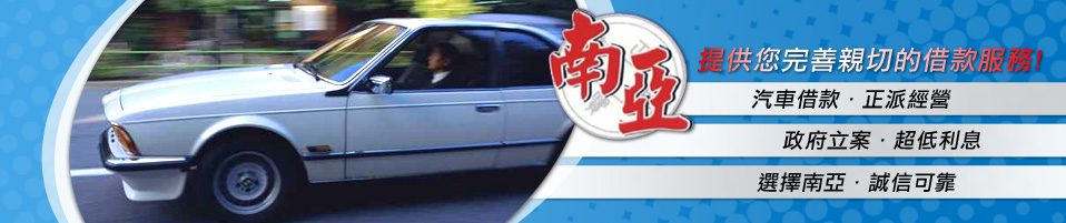 南亞汽車借款是大台南地區優良的當舖,只要是本國籍人士,不分職業,只要是成年人有急用現金者均可來本當舖辦理借款。本當舖借款條件寬鬆,只需具備有汽機車,公司廠房,黃金珠寶等等均可借款,本當舖利息超低,放款最快速,借款人可來電詢問或親自來本當舖洽詢借款事宜。南亞汽車借款當舖正派經營,不但是政府立案的合法當舖,也是媒體報導過的優良當舖,一切的利息也是政府法令所規定的合法範圍內收取,絕不超收任何利息,本當舖不是地下錢莊,請借款人安心借輕鬆還,無需擔心利息問題。萬物可借,利息超低,還提供支客票貼現,歡迎洽辦。
